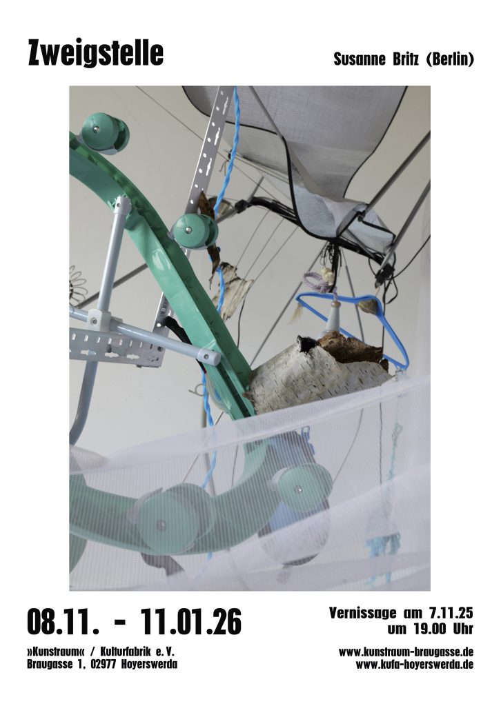 Der Ausstellungstitel Zweigstelle beschreibt humorvoll die sich verzweigenden Werkreihen der Berliner Künstlerin Susanne Britz. Der Kunstraum Braugasse, ist dem Titel entsprechend ein für sie ausgelagerter Raum des Erforschens, der ihr eine Soloausstellung widmet.